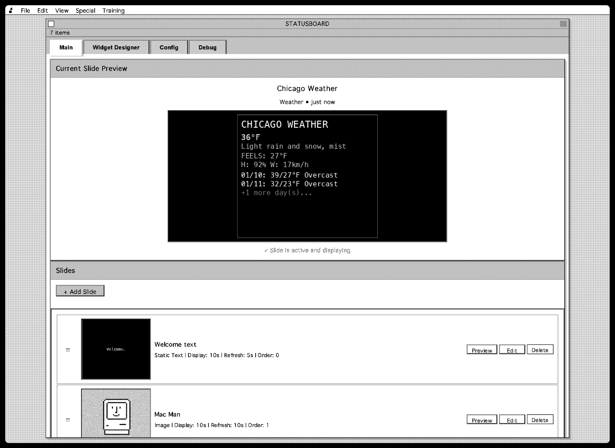 The unit runs a lightweight local web interface that controls what appears on the screen. From any browser on the local network, you can create, reorder, and configure individual display slides—such as weather, system status, static text, or images.